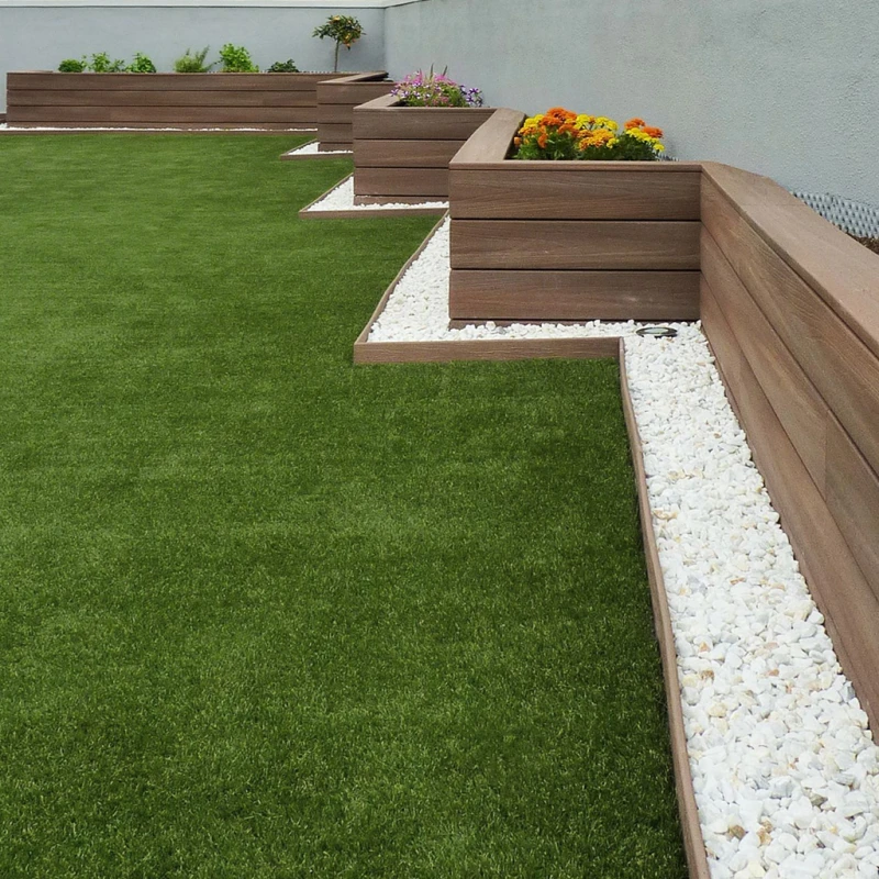 Composición: Fibras sinteticas teñidas en masa y backing de latex microperforado. Usos: Exterior e Interior. Altura: 20mm