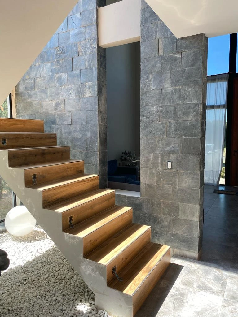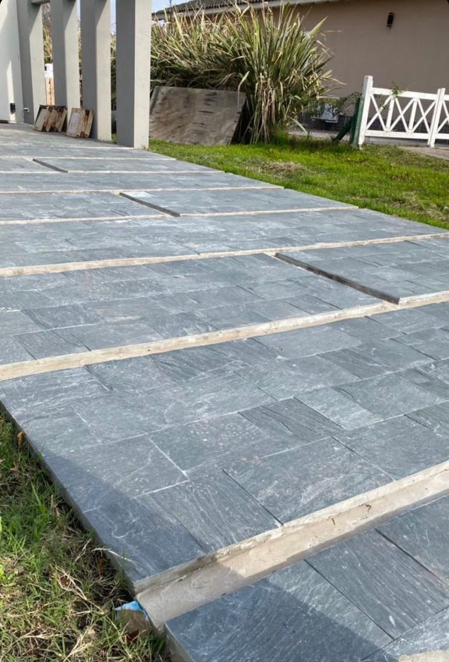 Piedra Natural en lajas rectificadas en sus 4 lados lo que posibilita una muy sencilla colocación. Predominando colores grises oscuros tirando a negro con pequeñas vetas blancas. De textura lisa y terminación brillosa! Utilizable en exterior como en interior, tanto en pisos como paredes. Peso: 30kg/m2.