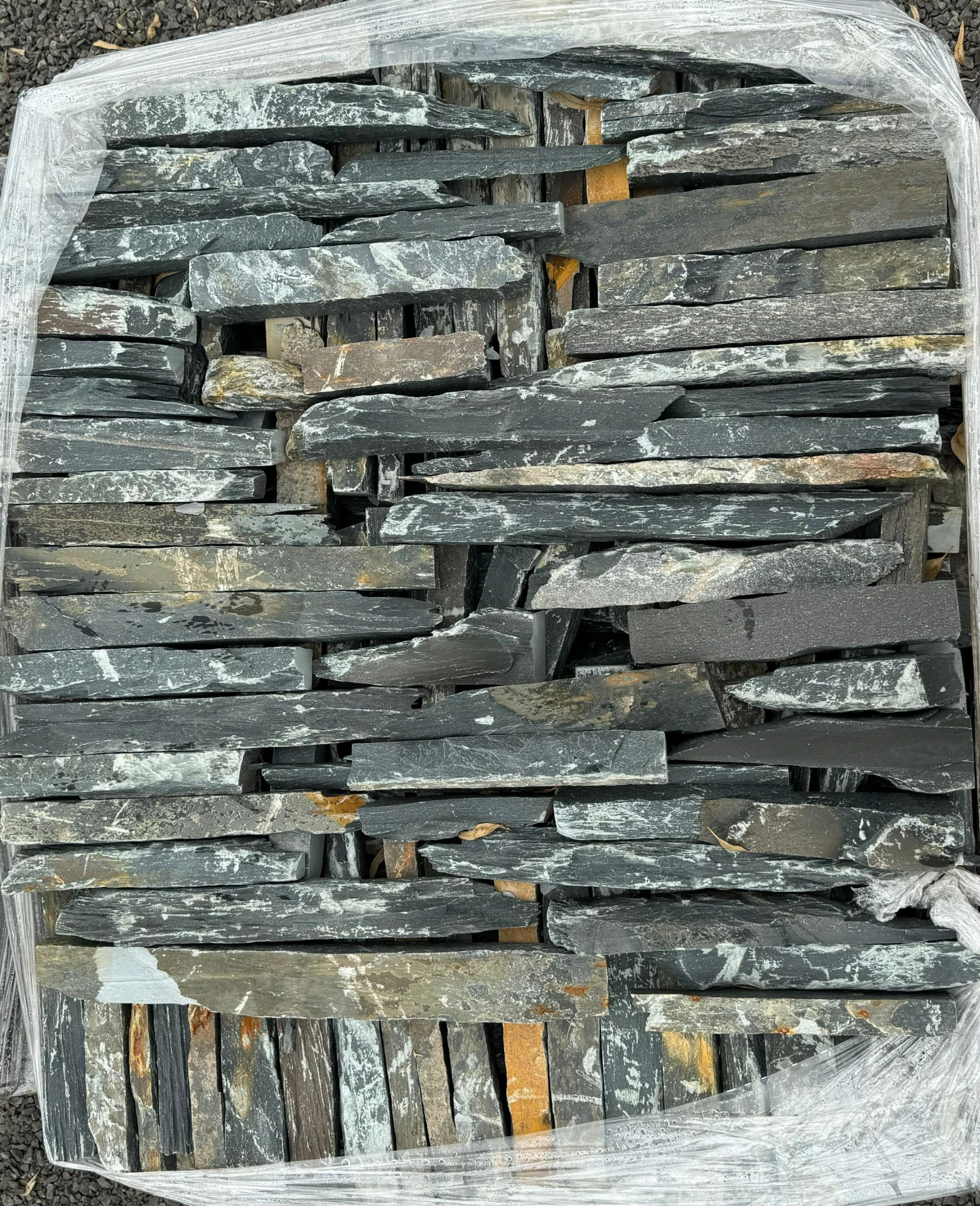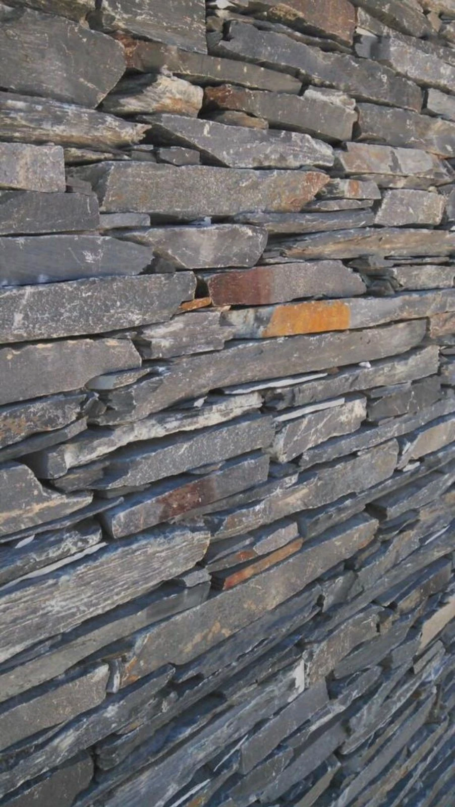 Piedra Natural de rasgos irregulares tanto en largo, alto y espesor, logrando el efecto más rústico posible con una piedra. Predominando tonalidades negras, grises y oxidadas. Utilizable tanto en exterior como interior. Peso: 100kg/m2.